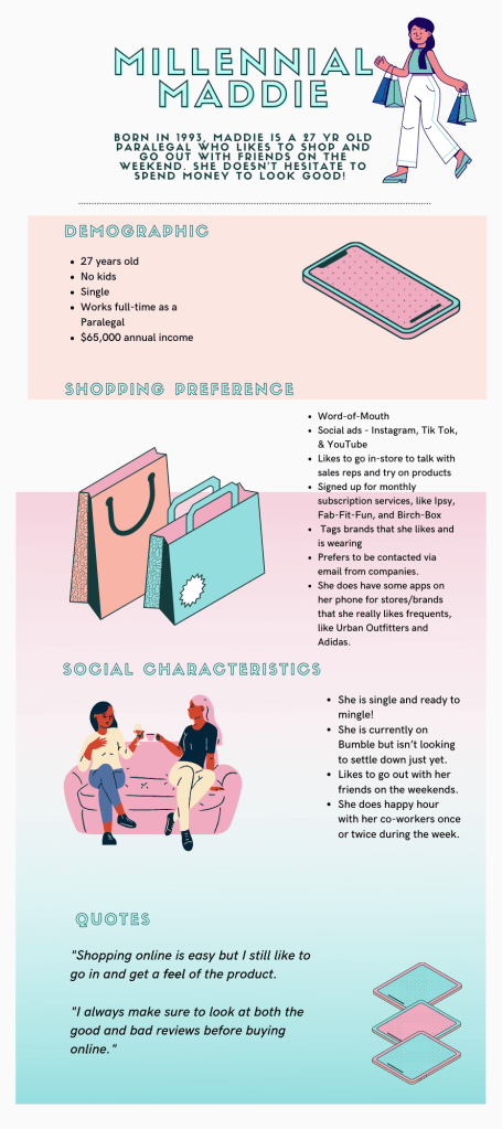 The typical shopping experience has changed so much, even before COVID! Online shopping, curbside, order online and pickup in the store….we have so many options now! Which is both thrilling and distressing because it makes it more difficult to predict and track how people shop. But looking at Millennial Maddie and understanding her a little better now, my group predicted Maddie’s shopping preferences.